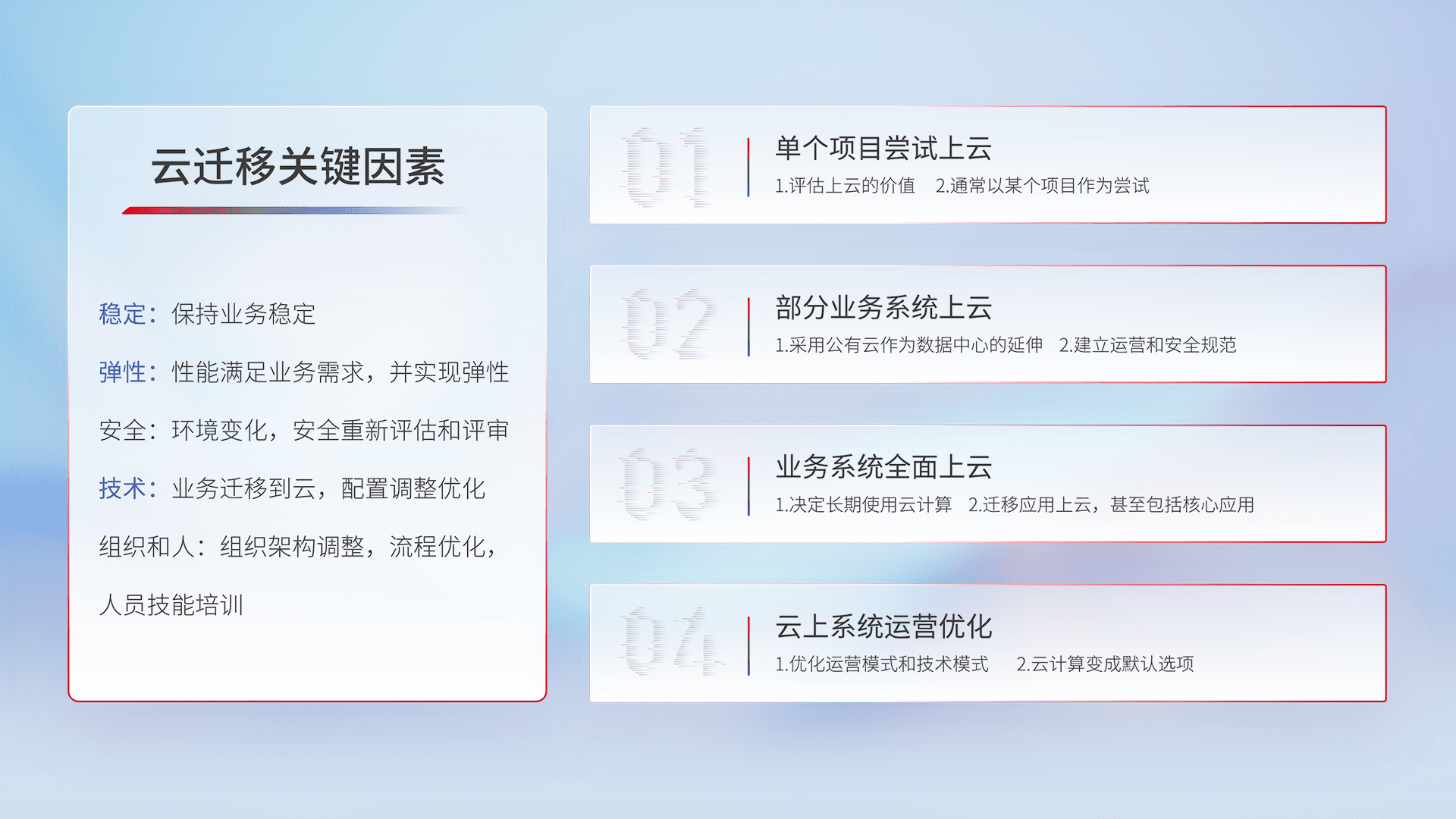 结合实际业务,,从规划设计、、、、云平台选型、、、、云原生改造、、、数据迁移、、、集成交付,,迁移全过程为客户识别最佳上云路径,,,做好风险识别管理,,,设计网络架构、、、、身份权限、、、、安全审计合规、、操作审计、、、、日志审计、、监控告警策略、、、多站点容灾设计等,,对云上基础设施进行整体规划,,,提升IT治理水平,,,以满足弹性、、、、高可用、、高性能的需求。。。